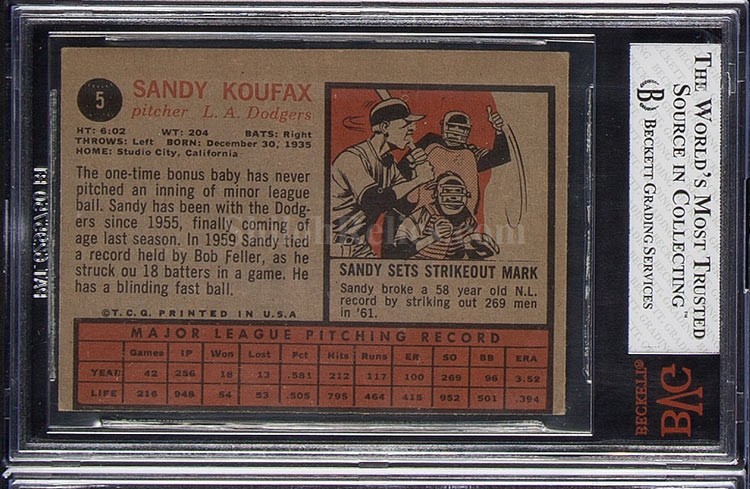 Here is an original card from the 1962 Topps set of Baseball Cards. This is #5 which is of Sandy Koufax, pitcher for the Los Angeles Dodgers. He was inducted into the Major League Baseball Hall of Fame with the class of 1972 and was the youngest player ever inducted. During his career, he was a 7 time All-Star (1961–1962, 1963–1966) and a 4× World Series champion (1955, 1959, 1963, 1965). He took home the NL MVP (1963) and was a 3 time Cy Young Award (1963, 1965, 1966) and a 2 time World Series MVP (1963, 1965). He won the Triple Crown 3 times (1963, 1965, 1966) and was also a 3 time MLB wins leader (1963, 1965, 1966) and a 5 time NL ERA leader (1962–1966) and 4 time MLB strikeout leader (1961, 1963, 1965, 1966). He pitched a perfect game on September 9, 1965 as well as Pitching four no-hitters. The Los Angeles Dodgers retired his No. 32 jersey number. He was honored as a member of the Major League Baseball All-Century Team and the Major League Baseball All-Time Team. The card was professionally graded by the BVG Company and they rated it as a 4, which stands for Very Good to Excellent. It is in their acid free holder for display and preservation.