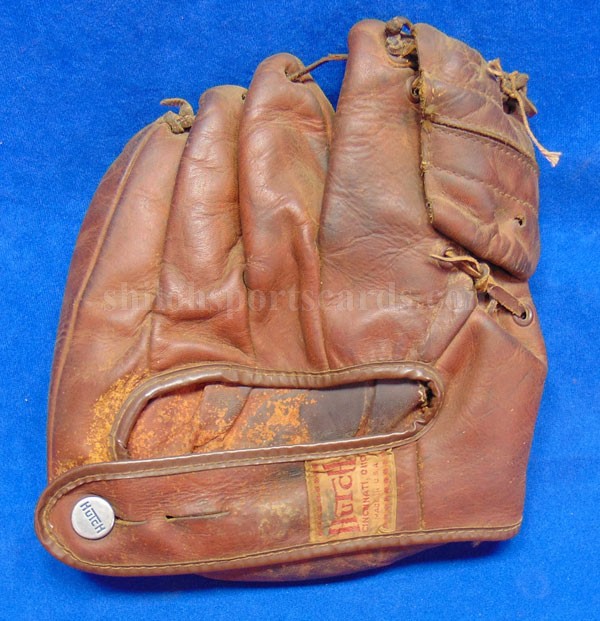 This is a neat and affordable piece of baseball memorabilia. This is a store model baseball glove that was made by the Hutch Company. The companies would use the name of a popular baseball player to help the gloves sell. This one was made using the name of Johnny Sain. John Franklin "Johnny" Sain (September 25, 1917 – November 7, 2006) was an American right-handed pitcher in Major League Baseball. Sain played for the Boston Braves (1942, 1946–1951), the New York Yankees (1951–1955), the Kansas City Athletics (1955) and he also coached the Kansas City Athletics (1959), the New York Yankees (1961–1963), the Minnesota Twins (1965–1966), the Detroit Tigers (1967–1969), the Chicago White Sox (1971–1975) and the Atlanta Braves (1977, 1985–1986). During that career, Sain was a 3 time All-Star (1947, 1948, 1953), a 6 time World Series champion (1951–1953, 1961, 1962, 1968), the NL wins leader (1948) and is a member of the Braves Hall of Fame. You can tell that the owner used it but it wasn't abused. This glove is one that I bought when I was a child. It has spent the last 35 years on a wall at my parents' house. The leather has stiffened over the years but it still displays well as you can see. This is a chance at a neat glove!