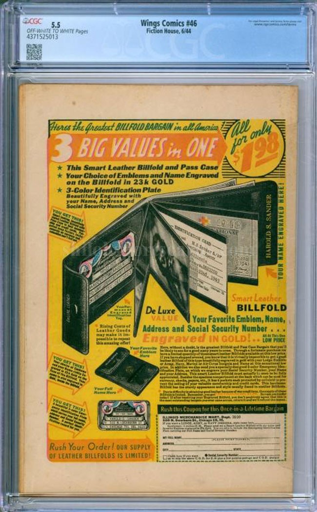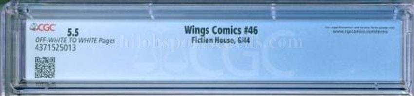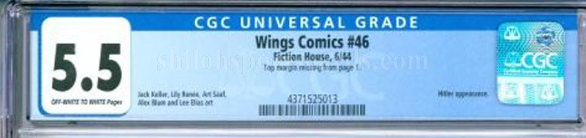 Here is an original issue of Fiction House Wings Comics #46 CGC 5.5 FN-. It has Off-White to White pages. The book featured a great plane scene cover and a Hitler appearance in the story. The book has been professionally graded by the CGC Company and they rated it as a 5.5, which stands for Fine- Condition. It is encapsulated in their holder for display and preservation.