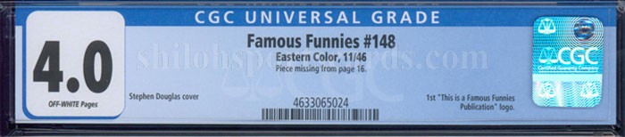 Here is an original issue of Famous Funnies #148 (Eastern Color, 1946) CGC VF 4.0 with Off-white to white pages. Stephen Douglas cover. The book has been professionally graded by the CGC Company and they rated it as a 4.0 which stands for Very Good Condition with a notation of a piece missing from page 16. It is encapsulated in their holder for display and preservation.