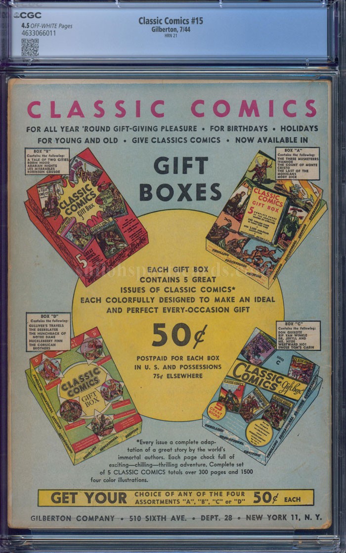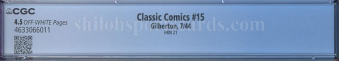 Here is an original issue of Classic Comics #15 Uncle Tom's Cabin - First Edition (Gilberton, 1943) CGC VG/FN 4.5 with Off-white pages. Adapts the novel by Harriet Beecher Stowe. Original edition. Used in Seduction of the Innocent. Rolland Livingston art. The book has been professionally graded by the CGC Company and they rated it as a 4.5 which stands for Very Good + Condition. It is encapsulated in their holder for display and preservation.
