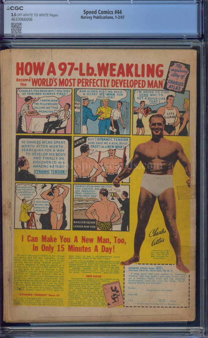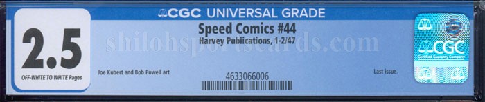 Here is an original issue of Speed Comics #44 (Harvey, 1947) CGC 2.5 with off-white to white pages. Last issue of the title. Rudy Palais cover. Joe Kubert and Bob Powell art. The book has been professionally graded by the CGC Company and they rated it as a 2.5 which stands for Good Condition. It is encapsulated in their holder for display and preservation.