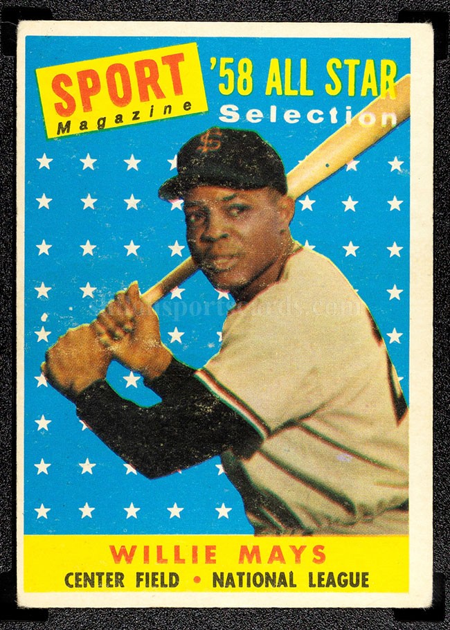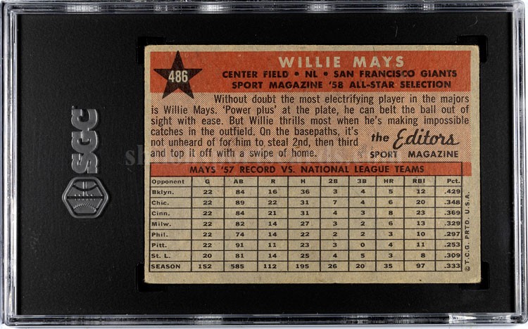 Here is an original card from the 1958 Topps set of Baseball Cards. This is #486 which is the All-Star card of Willie Mays of the San Francisco Giants. He was inducted into the Major League Baseball Hall of Fame with the class of 1979. During his cazreer, Mays was a 24 time All-Star (1954–1973) and was a World Series champion (1954). He won 2 NL MVP (1954, 1965) as well as the NL Rookie of the Year (1951). He earned being a 12 time Gold Glove Award (1957–1968) and the Roberto Clemente Award (1971) and was the NL batting champion (1954). Mays was a 4 time NL home run leader (1955, 1962, 1964, 1965) as well as being a 4 time NL stolen base leader (1956–1959). He hit 4 home runs in one game on April 30, 1961. The San Francisco Giants retired his No. 24 jersey as did the New York Mets. He was honored as a member of the San Francisco Giants Wall of Fame, the Major League Baseball All-Century Team and the Major League Baseball All-Time Team. It is in nice displaying condition with a good look. It has been professionally graded by the SGC Company and they rated it as a 3, which stands for Very Good Condition. It comes in their acid-free holder for display and preservation.