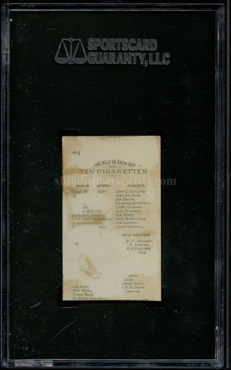 This is one of the scarce 1887 Allen & Ginter baseball cards. Allen & Ginter was a Richmond, Virginia, tobacco manufacturing company formed by John F. Allen and Lewis Ginter around 1880. The firm created and marketed the first cigarette cards for collecting and trading in the United States. Some of the notable cards in the series include baseball players Charles Comiskey, Cap Anson, and Jack Glasscock, as well as non-athletes like Buffalo Bill Cody. This is the card of John M. Ward of the Brooklyn Grooms. John Montgomery Ward (March 3, 1860 – March 4, 1925), also known as Monte Ward, was an American Major League Baseball pitcher, shortstop, second baseman, third baseman, manager, executive, union organizer, owner and author. Ward, of English descent, was born in Bellefonte, Pennsylvania and grew up in Renovo, Pennsylvania. He led the formation of the first professional sports players union and a new baseball league, the Players' League. The card has been professionally authenticated by the SGC Company. It comes in their holder for display and preservation.