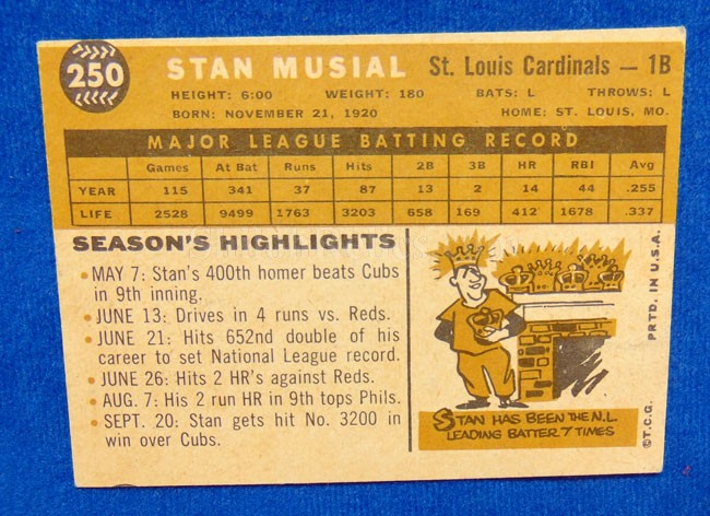 Here is an original autograph of a Baseball Hall of Famer! This is an original 1960 Topps card #250. The card is very nice in color with an off-center cut. It is signed in sharpie by St. Louis Cardinal, Stan Musial. Stanley Frank Musial (born Stanislaw