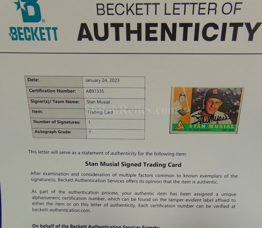 the Major League Baseball All-Century Team. The card autograph was professionally authenticated by the Beckett Company and they rated it as authentic and gave it a grade of 7 out of 10. It is accompanied by their their letter of authenticity.