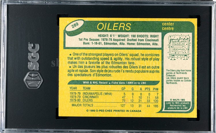 Here is an original card from the 1980-81 O-Pee-Chee set of Hockey Cards. This is #289 Edmonton Oilers Mark Messier. It has been professionally graded by the SGC Company and they rated it as an 5.5, which stands for Excellent Plus Condition. It comes in their acid-free holder for display and preservation.